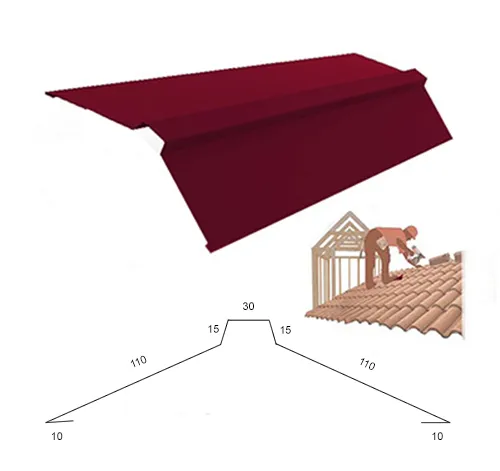 Закрывает профилированные листы на коньке, наружных переломах кровли, защищая от попадания влаги, грязи в подкровельное пространство и срыва профилированных листов порывами ветра.